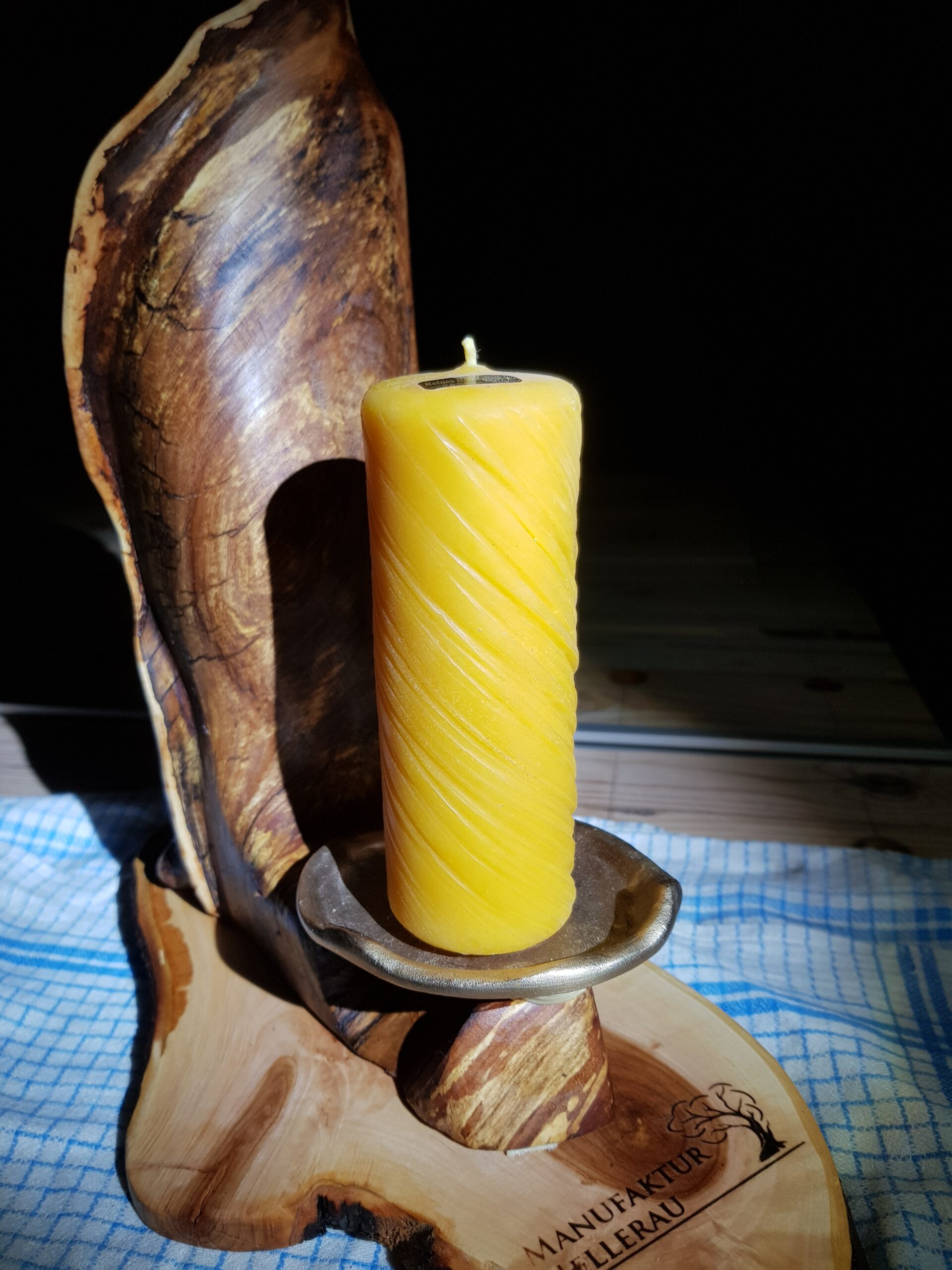 Es kommt in Kombination mit einer edlen Bienenwachskerze auf kleinem Bronzehalter.