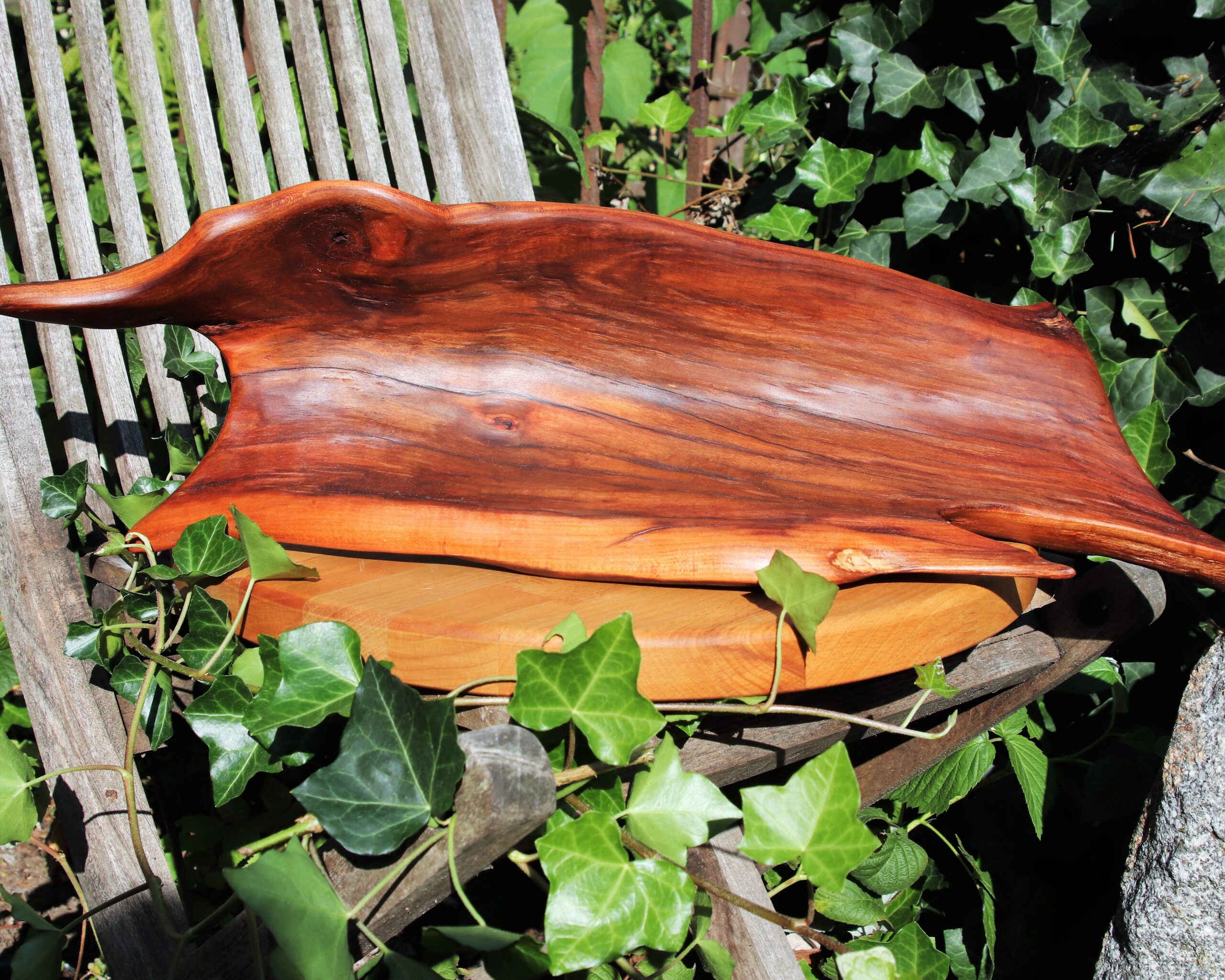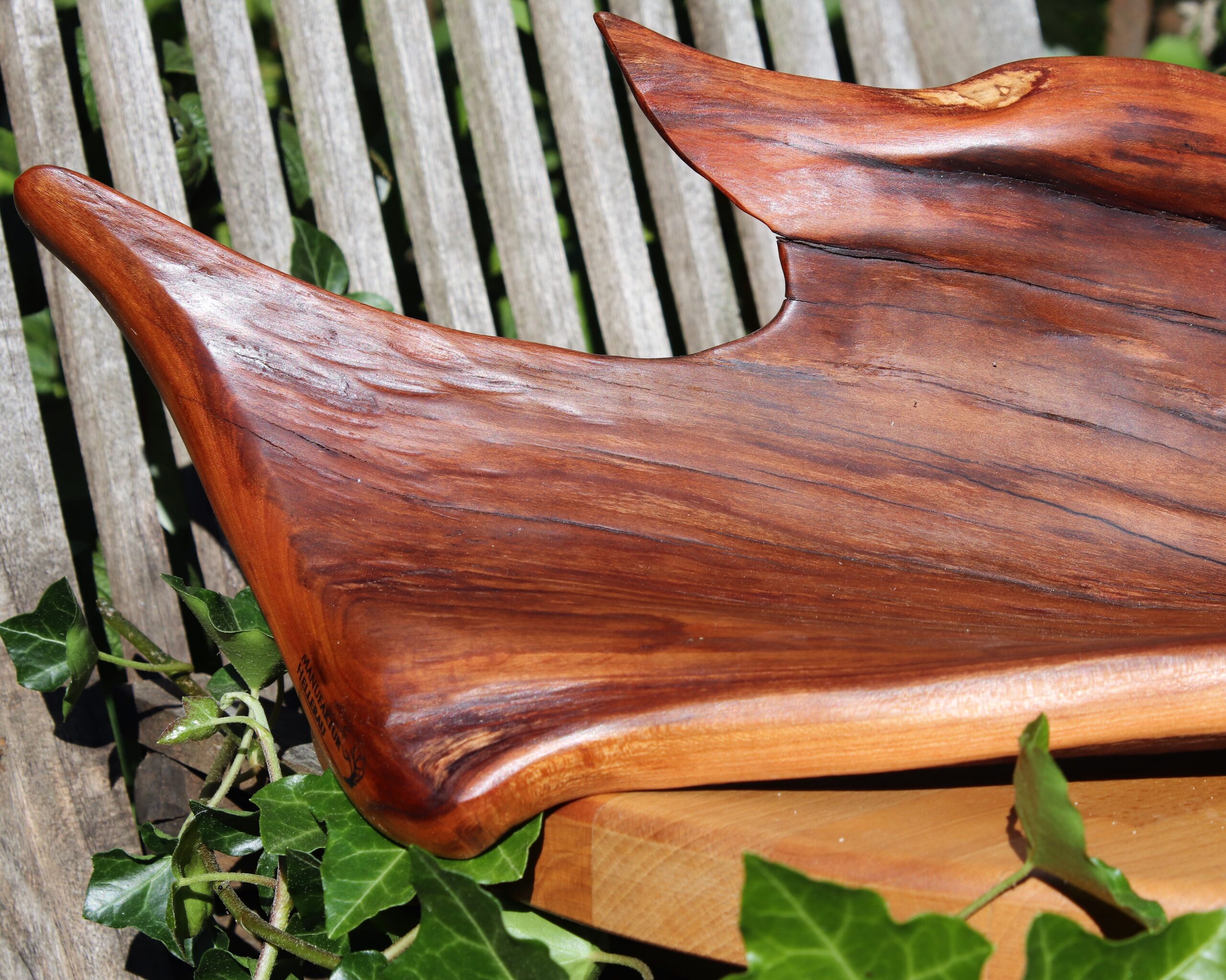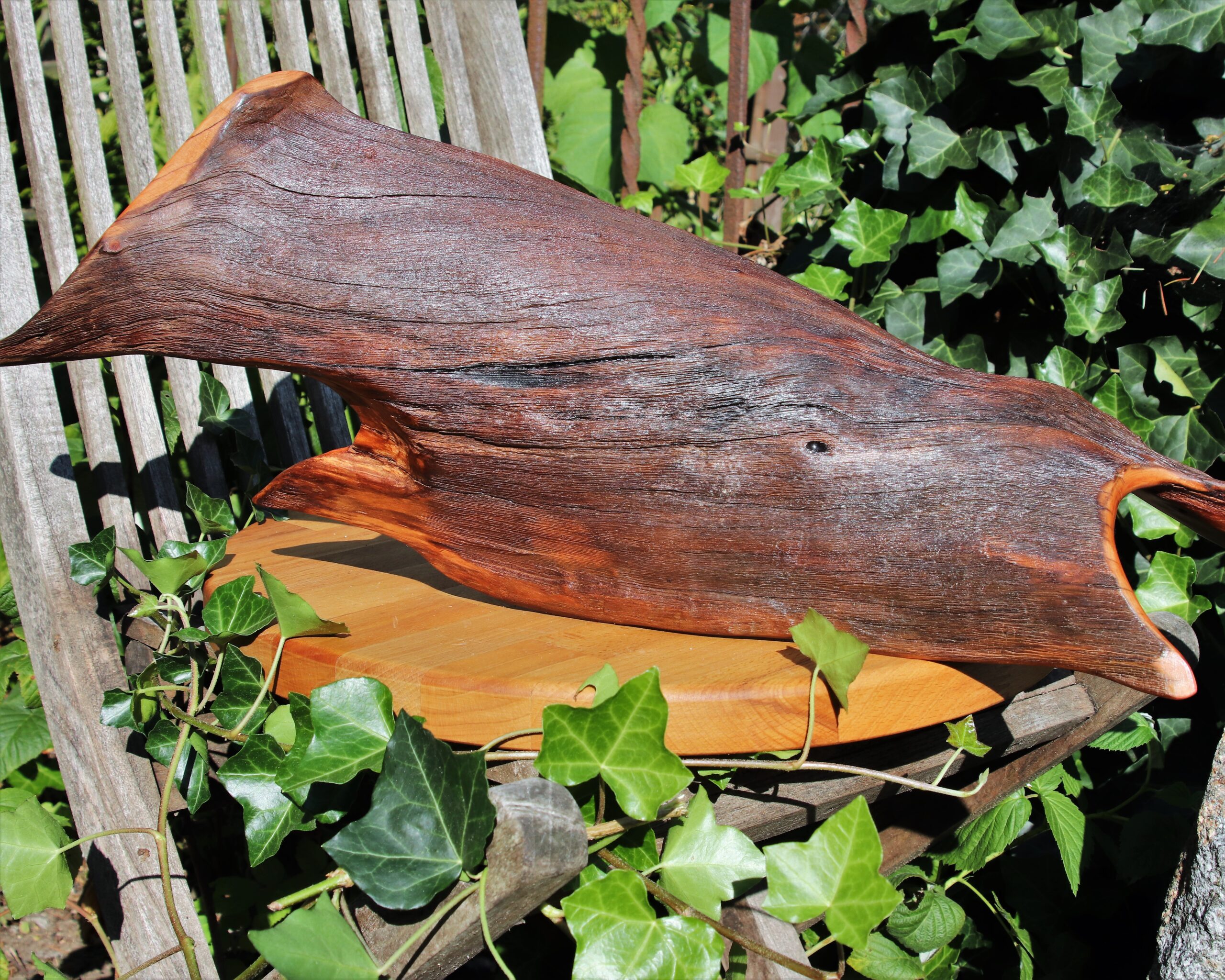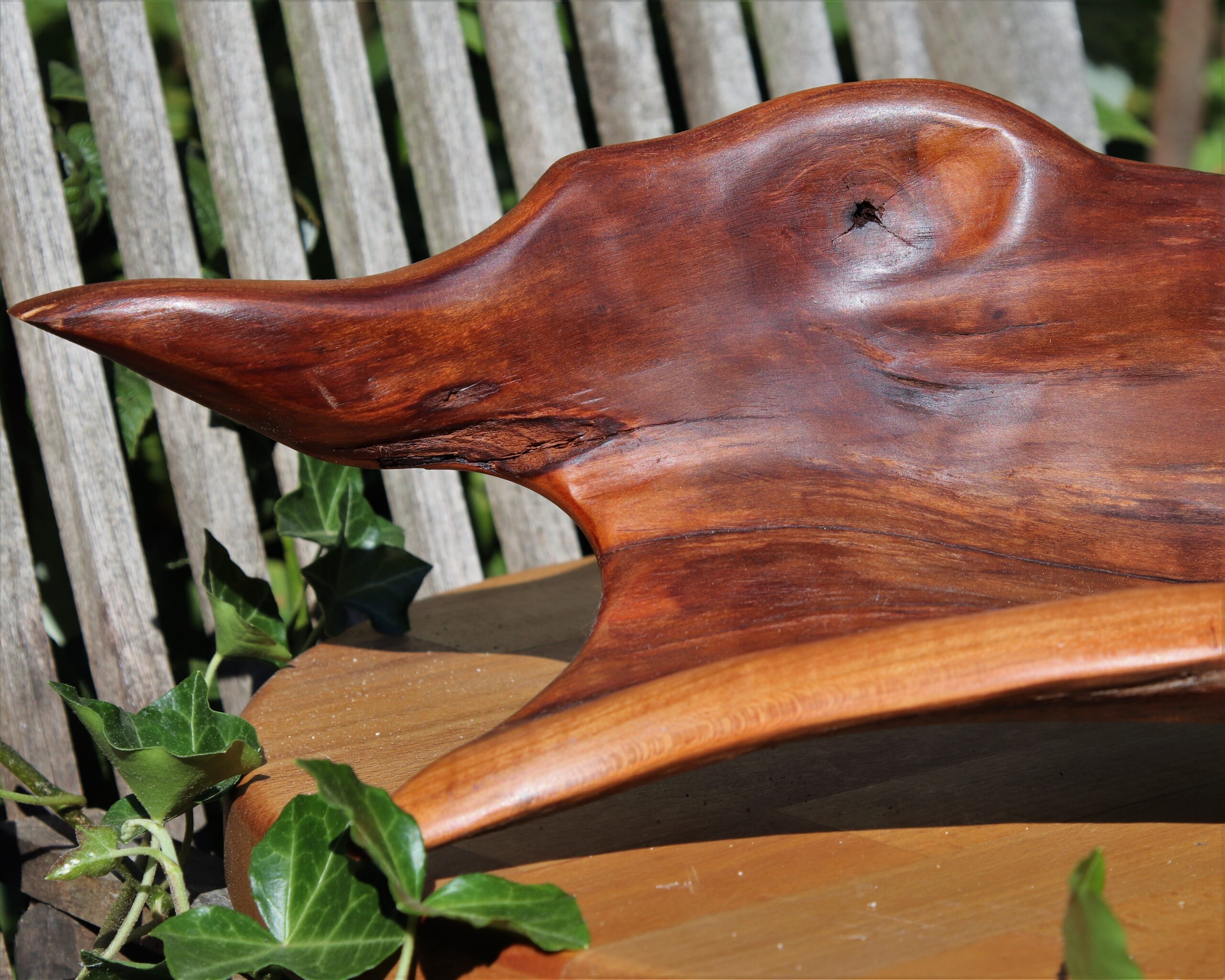 Als die Früchte versiegten und große Äste brachen, blieb nur das Fällen. Nach 10 Jahren als Biotop im Garten war nicht mehr viel übrig. Was aber blieb, vom alten Pflaumenbaum, ist dieses Stück Haut. Aus dem drehwüchsigen Stamm aufbereitet zu einer edlen Schale, indem das Weiche ging, das Harte harrte. Die raue Außenseite ist Zeugnis der langer Biografie, während die Innenseite durch Schliff, Politur und großzügige Ölgabe förmlich zu neuem Leben erwacht.