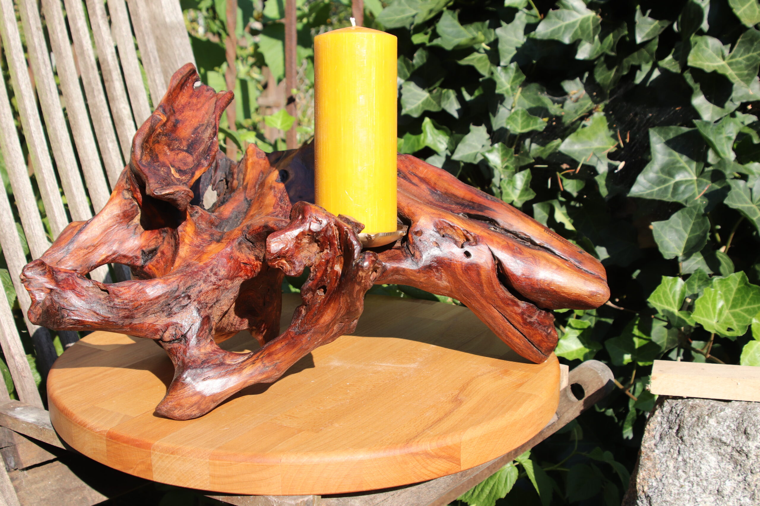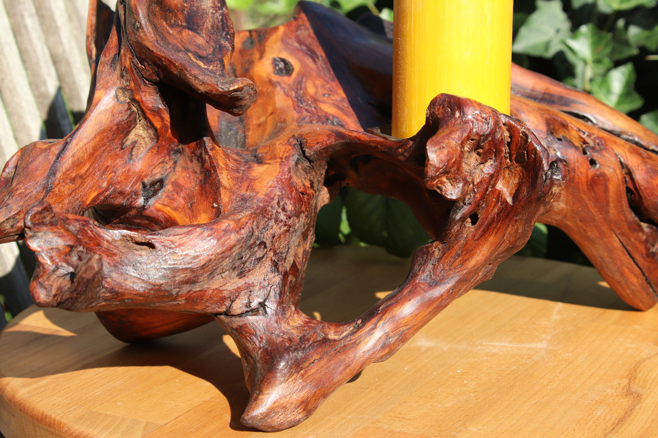 Vorsichtiges Freilegen der verzweigten Wurzelstruktur und das stückweise Entfernen der weichen Masse machen dann die Faszination Wurzelholz sichtbar. Vergleichbar mit einer Maserknolle  sind es unglaubliche Volten, welche die Holzfaser hier schlägt. Eine grandiose Struktur, die mit achtsamer Zuwendung schon die eigene Form und Schönheit vorgibt. So ist der Wurzelleuchter nur Ausdruck dessen, was schon war.